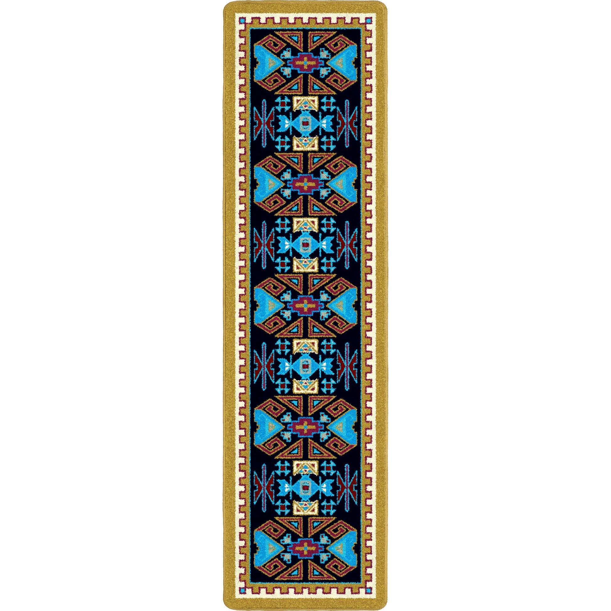 Hues of turquoise, egg plant and copper are juxeaposed against a black field and create a rug that will add a nice pop to any room in your home.