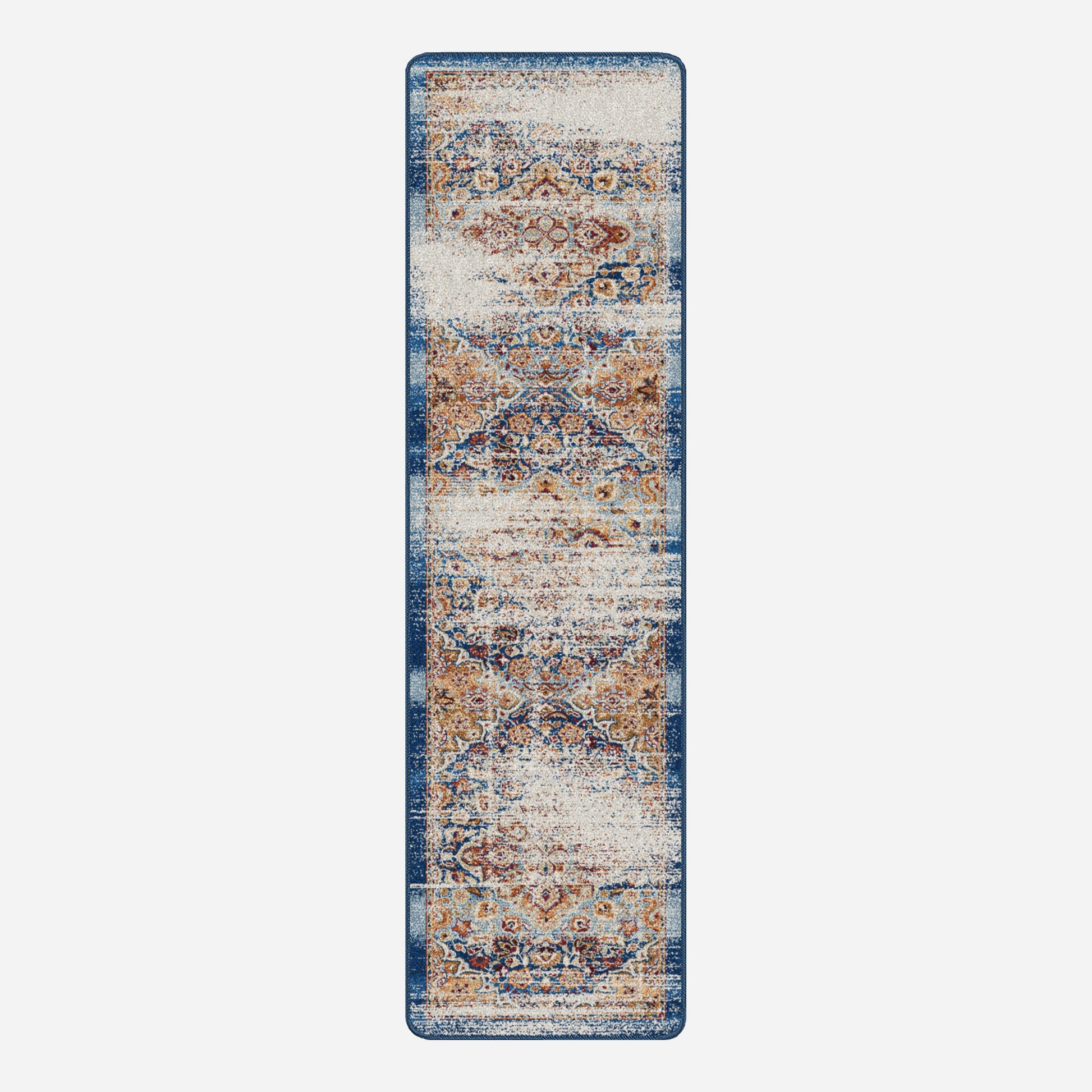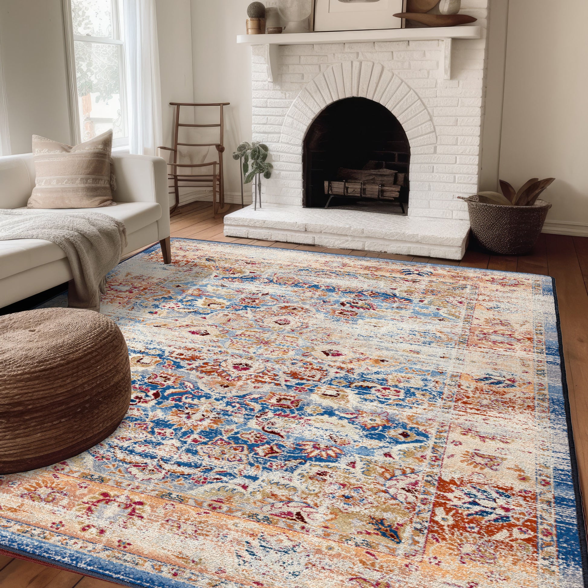 All the fine detail in this handsome rug is softened by the intentional distressed areas. Rich denim blues and shades of apricot and butterscotch make this rug a stunner.