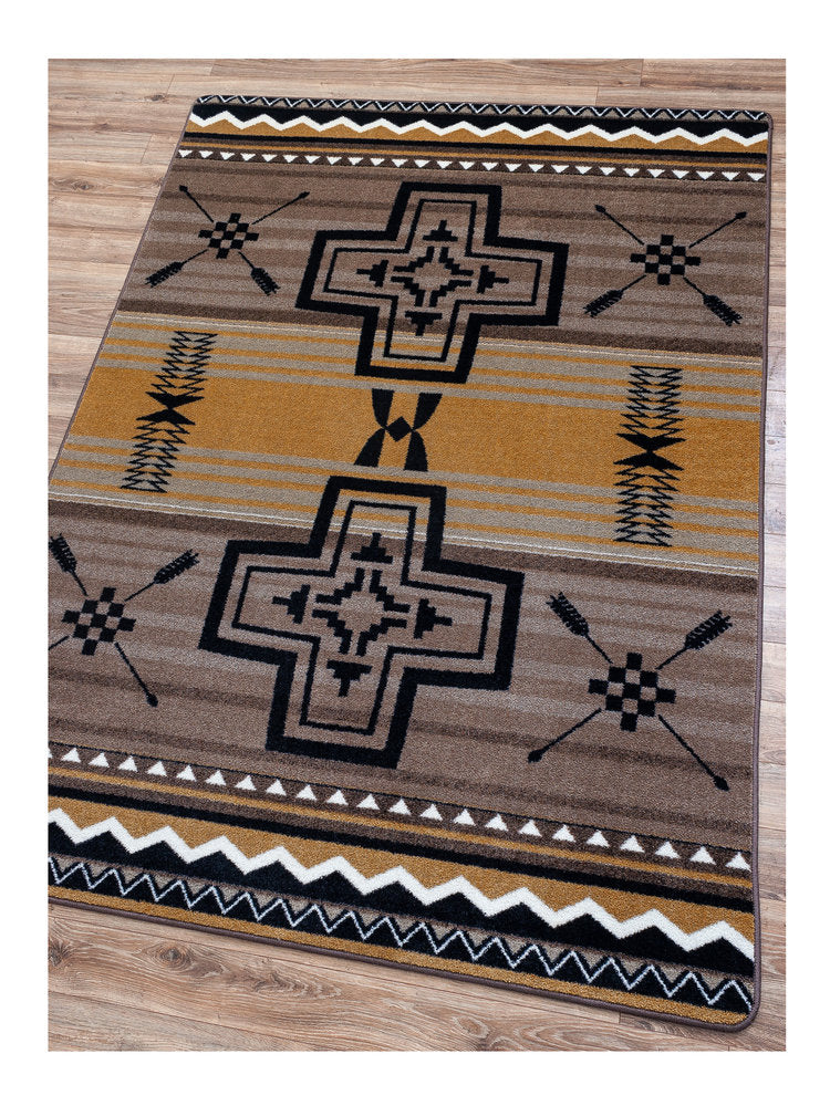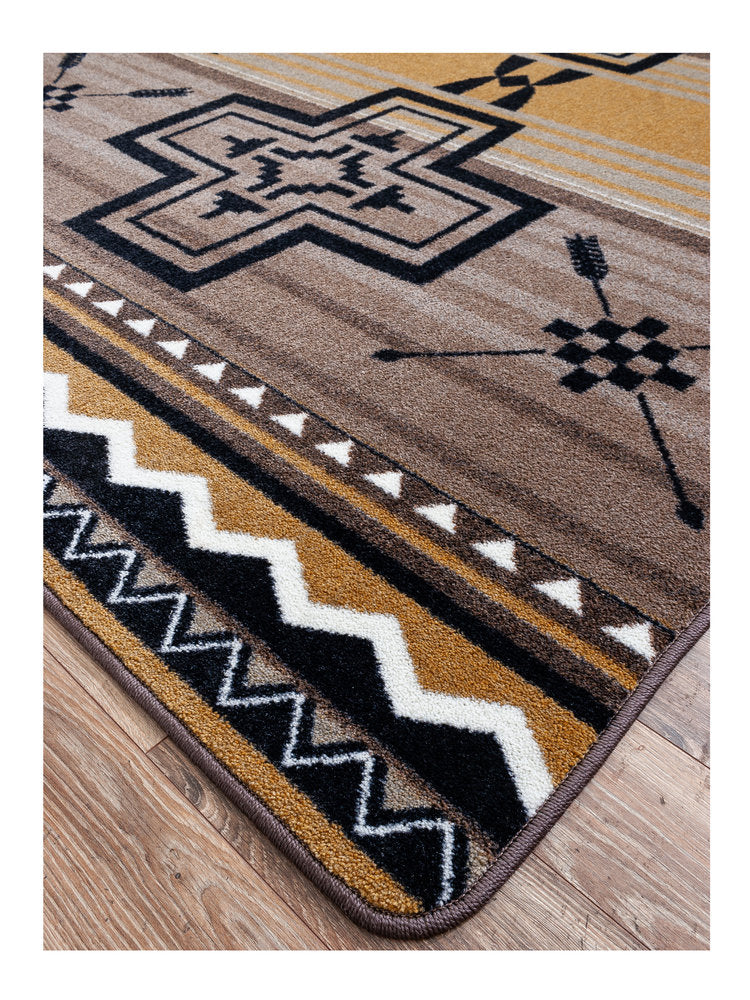 Enhance your space with the Southwest Abrazos - Old Gold by American Dakota Rugs, exclusively made-to-order in the USA. Designed for longevity and style, it boasts stain resistance, fade prevention, and is crafted from 100% EnduraStran nylon. Featuring lay-flat lockback technology for seamless placement, this rug is the epitome of American craftsmanship and durable decor.
