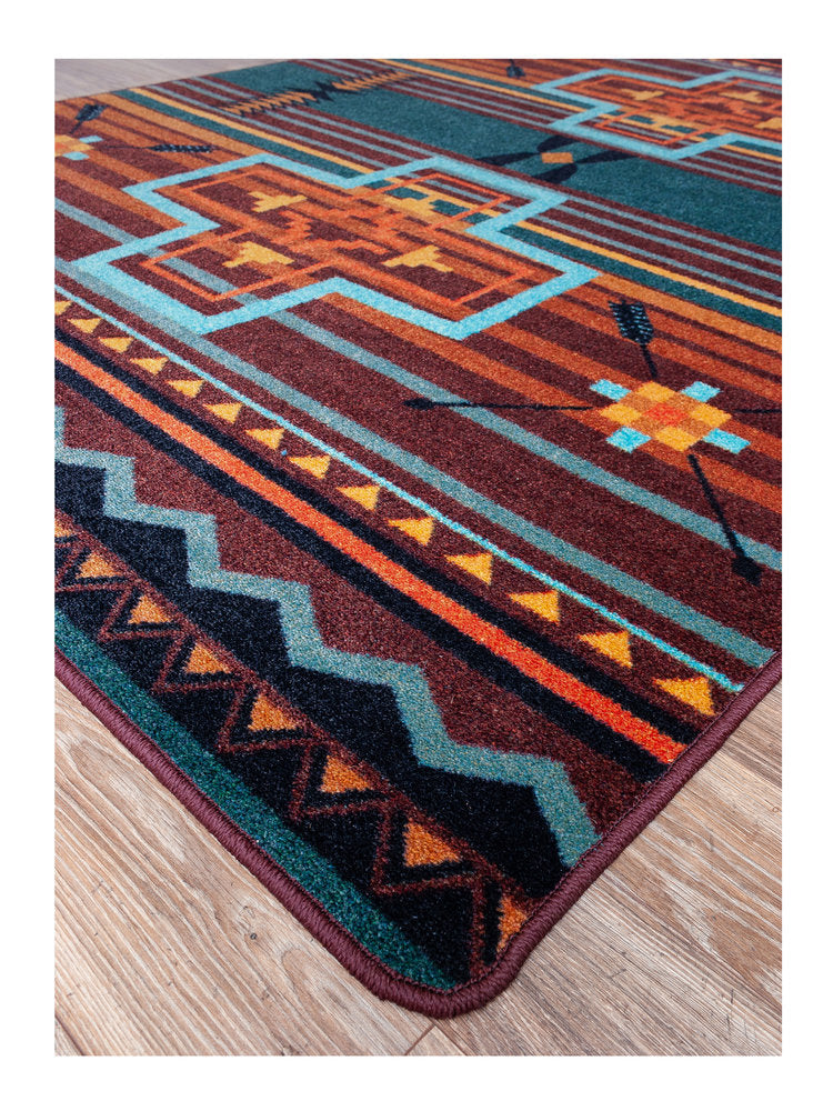 Enhance your space with the Southwest Abrazos - Sunset by American Dakota Rugs, exclusively made-to-order in the USA. Designed for longevity and style, it boasts stain resistance, fade prevention, and is crafted from 100% EnduraStran nylon. Featuring lay-flat lockback technology for seamless placement, this rug is the epitome of American craftsmanship and durable decor.