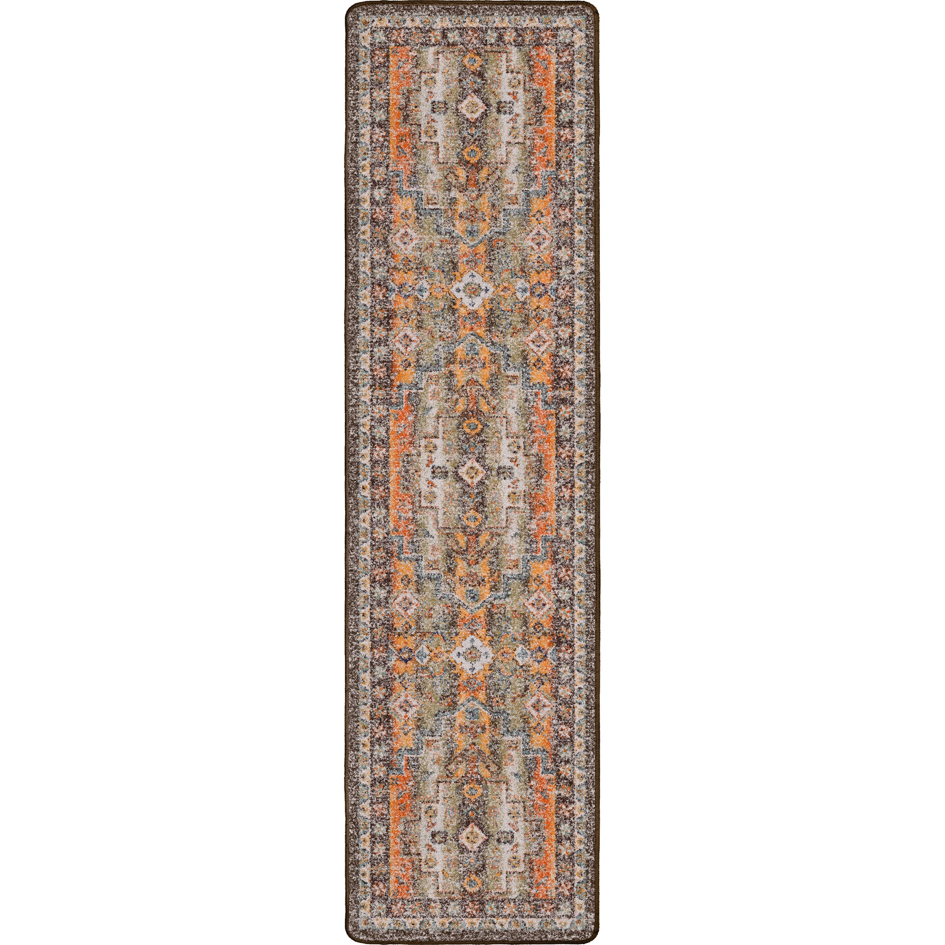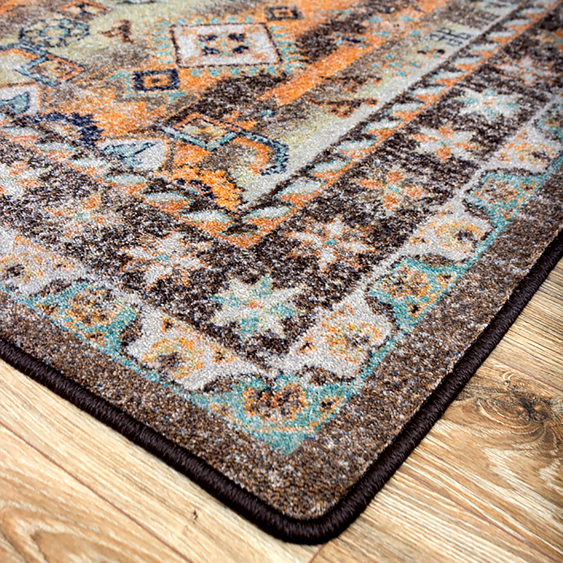 Old world Persian design meets modern style in this design, featuring splashes of Orange and Blue across a distressed light background.
