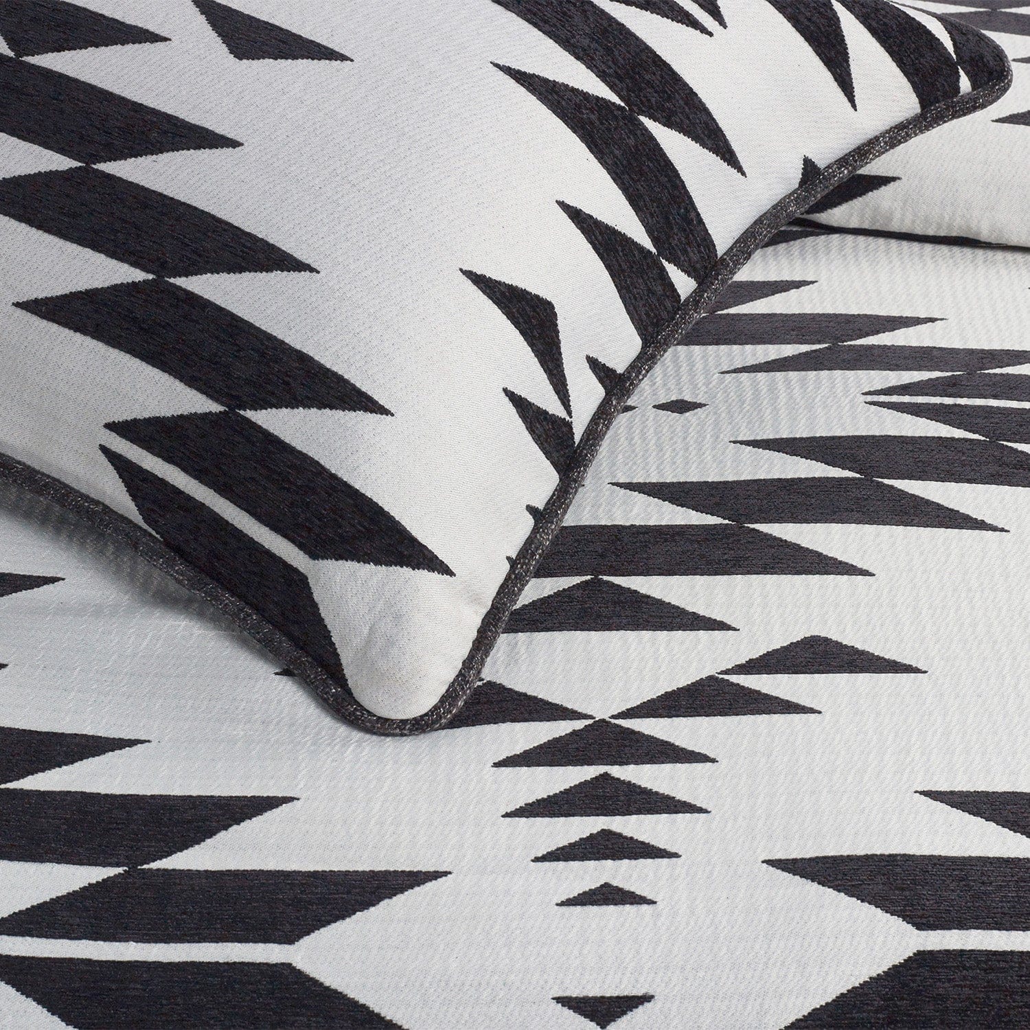 Modern monochrome combines with Aztec-inspired motifs in our Amelia Aztec Comforter Set, creating a sophisticated and balanced bedding ensemble. The symmetrical pattern draws your eyes and produces a visually stunning centerpiece for any rustic bedroom. Complete the look with Amelia's coordinating shams and pillows. Or layer with our Stonewashed Cotton Velvet Quilt or faux fur throws and pillows for a stylish finish. What's Included 1 Comforter + 2 Pillow Shams Dimensions Comforter: 92"W x 96"L; Pillow Sham: 21"W x 27"L Materials Comforter - Face: 100% polyester; Back: 100% cotton; Fill: 100% polyester. Pillow Sham - 100% polyester. Care Dry clean only.