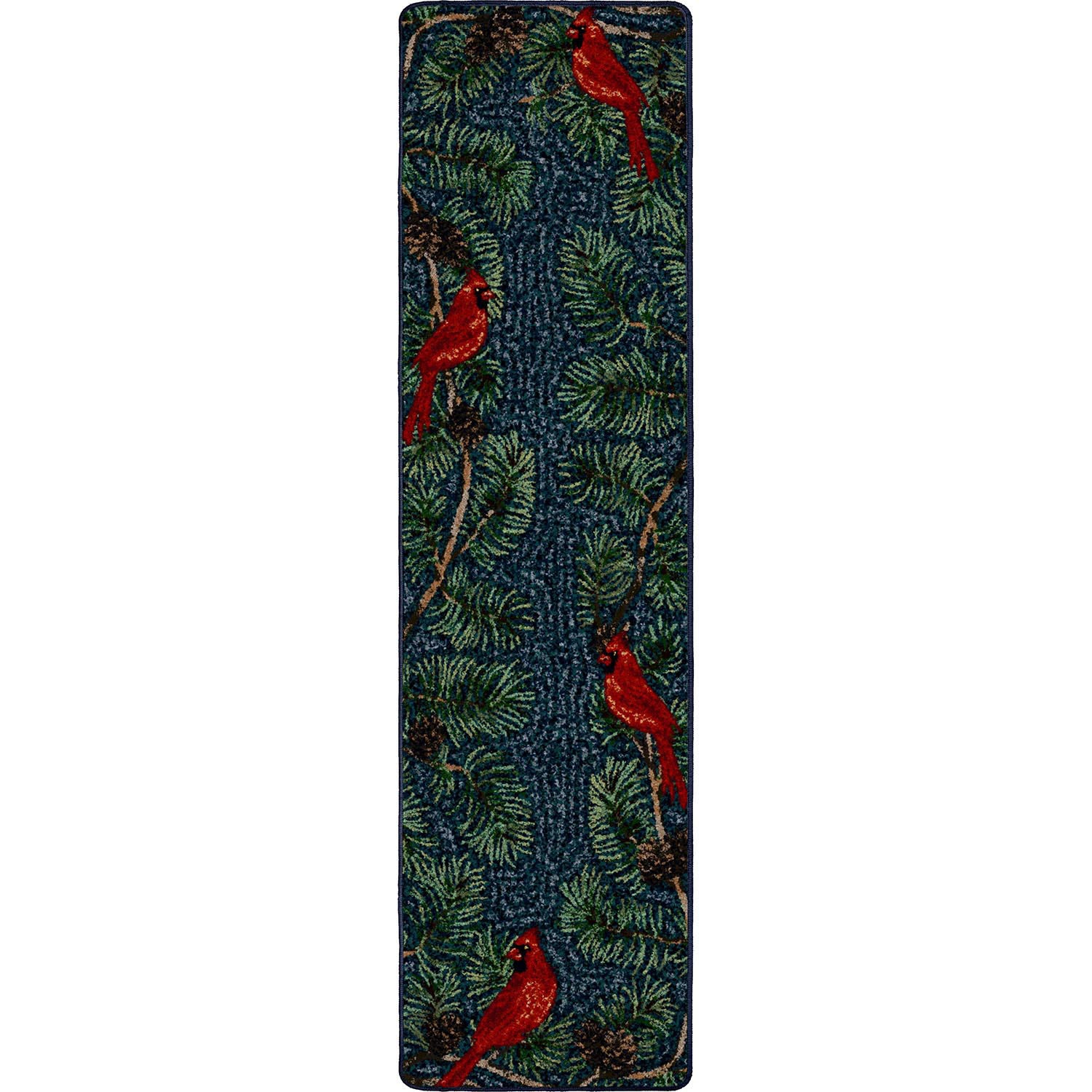 Handsome cardinals encircle this lively pine bough bordered rug.