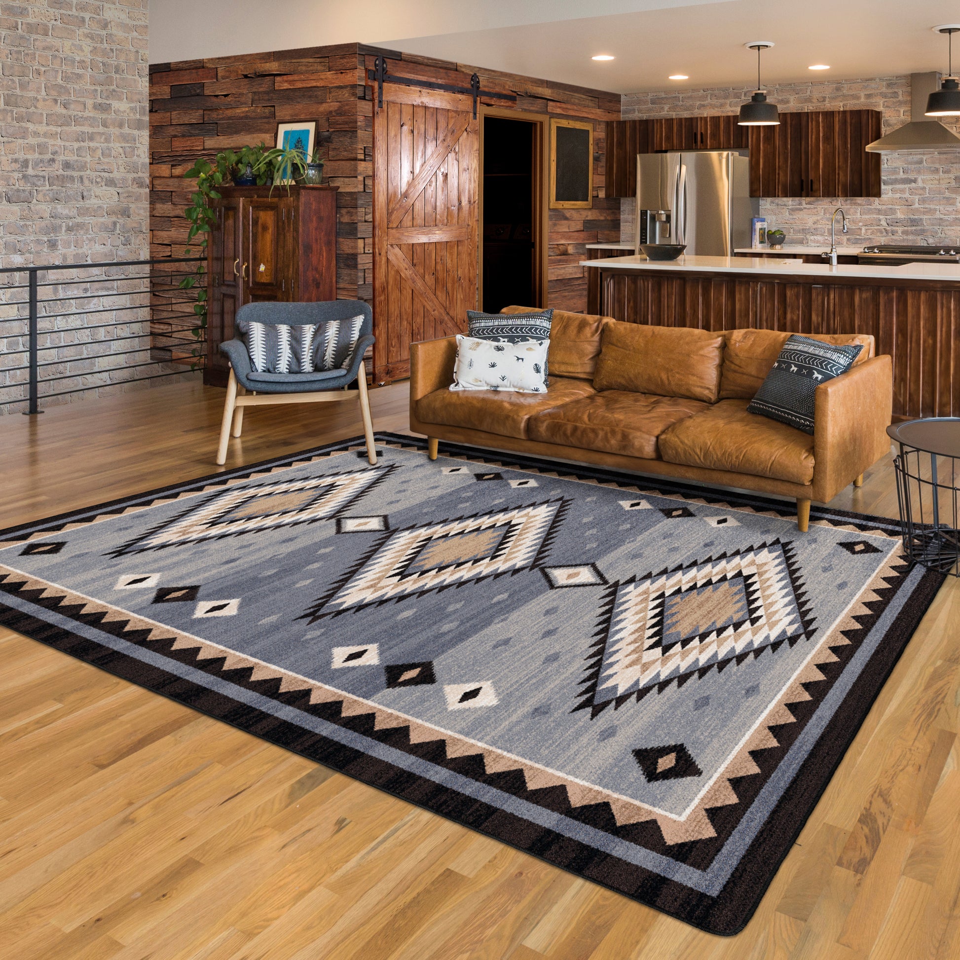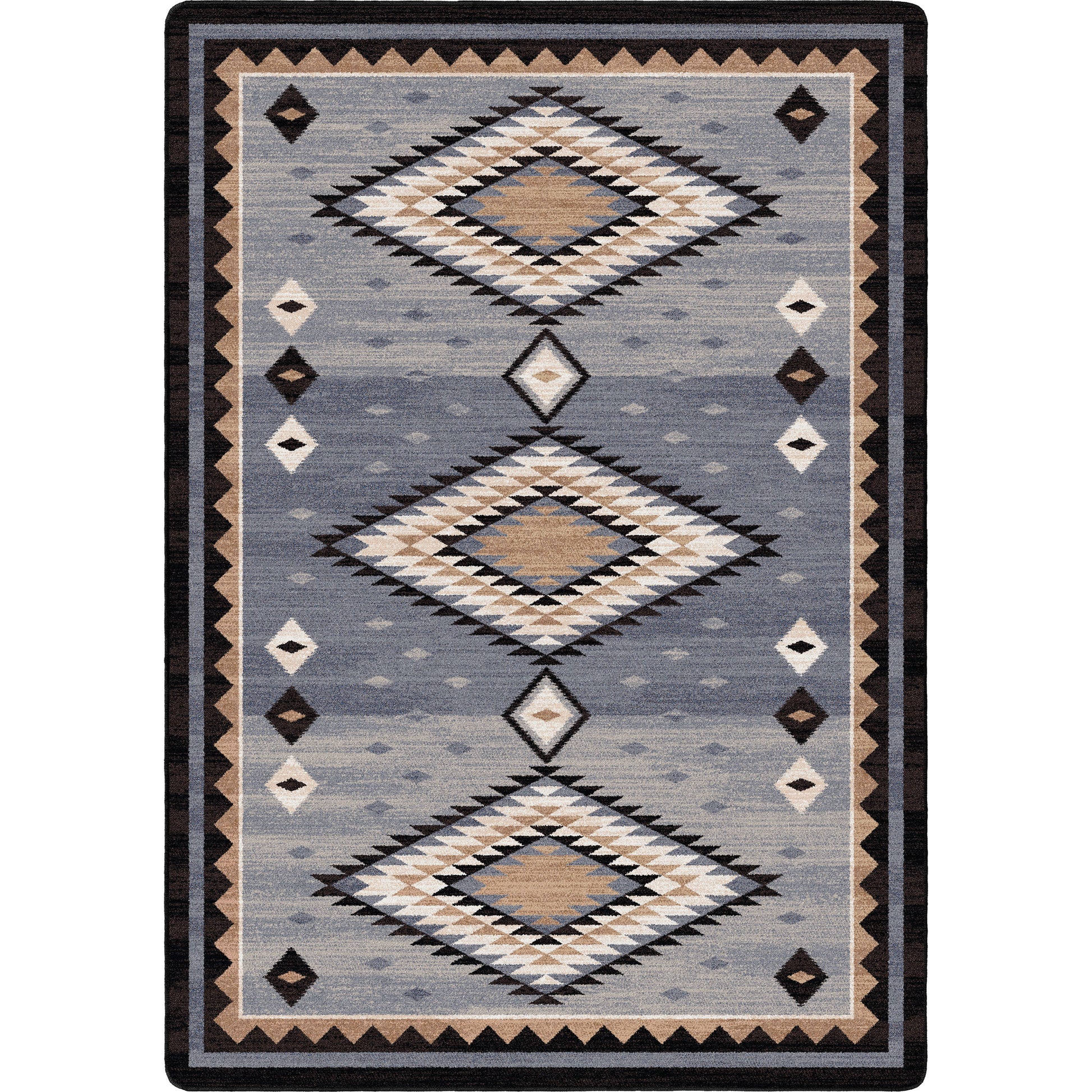 The two central figures in this rug may have just returned from a horse raid. The inlaid arrows tell part of the story. This striking rug turns an ordinary room into “The” room. MADE IN AMERICA!