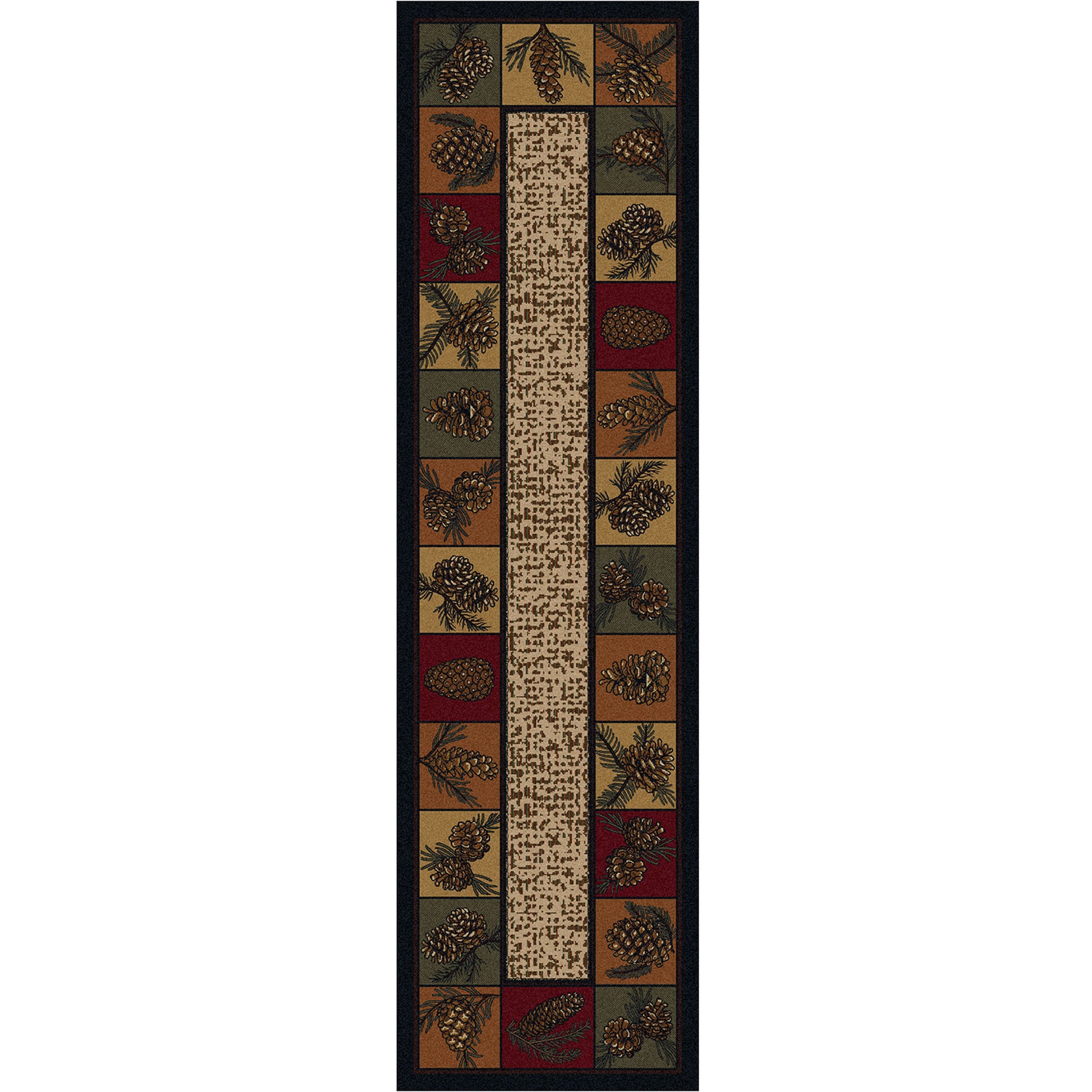 A framework of pine cone varieties adorn this cabin rug. Easy to decorate with and stain resistant. Cleans easily with just water.