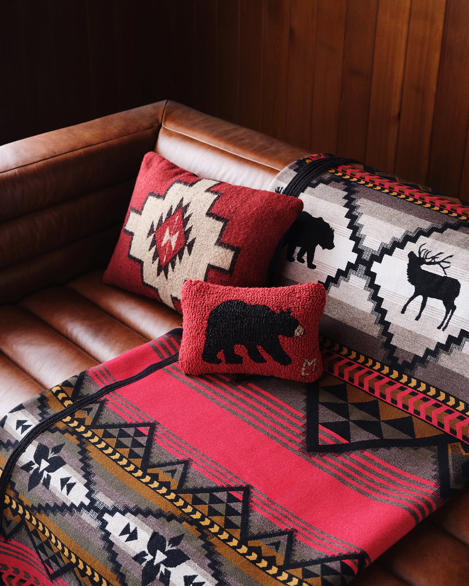 In this USA-made wool blanket design, two peaked bands represent the Columbia River Drainage Basins divided by Lost Trail: Bitterroot Clark-Fork to the north, and Salmon to the south. The middle band showcases some of the wildlife that call the area home.