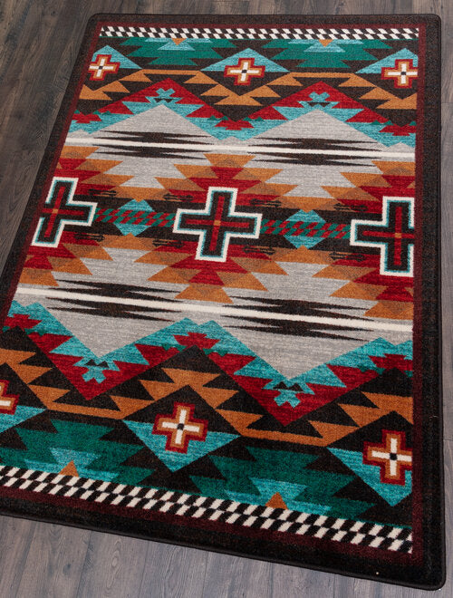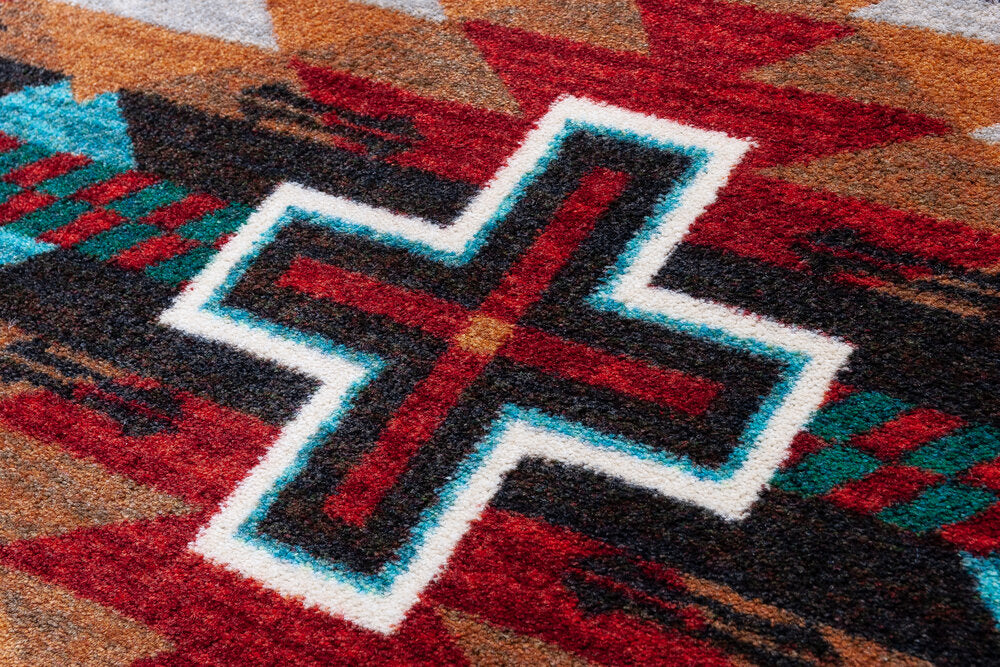 Enhance your space with the Rustic Crucifix - Electric by American Dakota Rugs, exclusively made-to-order in the USA. Designed for longevity and style, it boasts stain resistance, fade prevention, and is crafted from 100% EnduraStran nylon. Featuring lay-flat lockback technology for seamless placement, this rug is the epitome of American craftsmanship and durable decor.